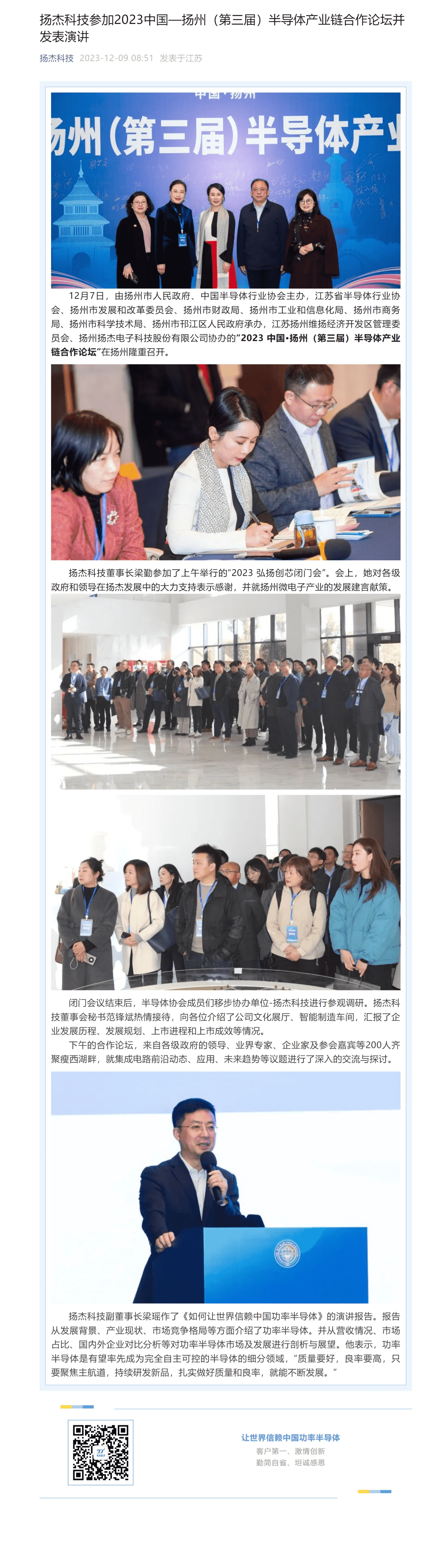 扬杰科技参加2023中国—扬州(第三届)半导体产业链合作论坛并发表演讲