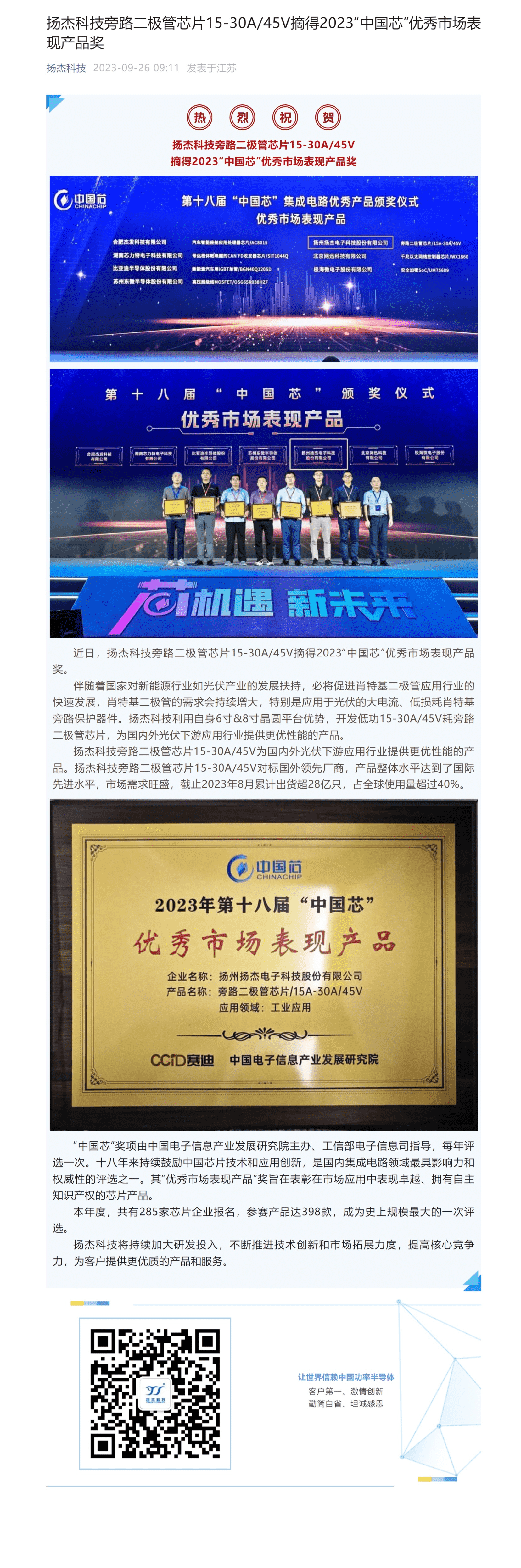 扬杰科技旁路二极管芯片15-30A/45V摘得2023“中国芯”优秀市场表现产品奖