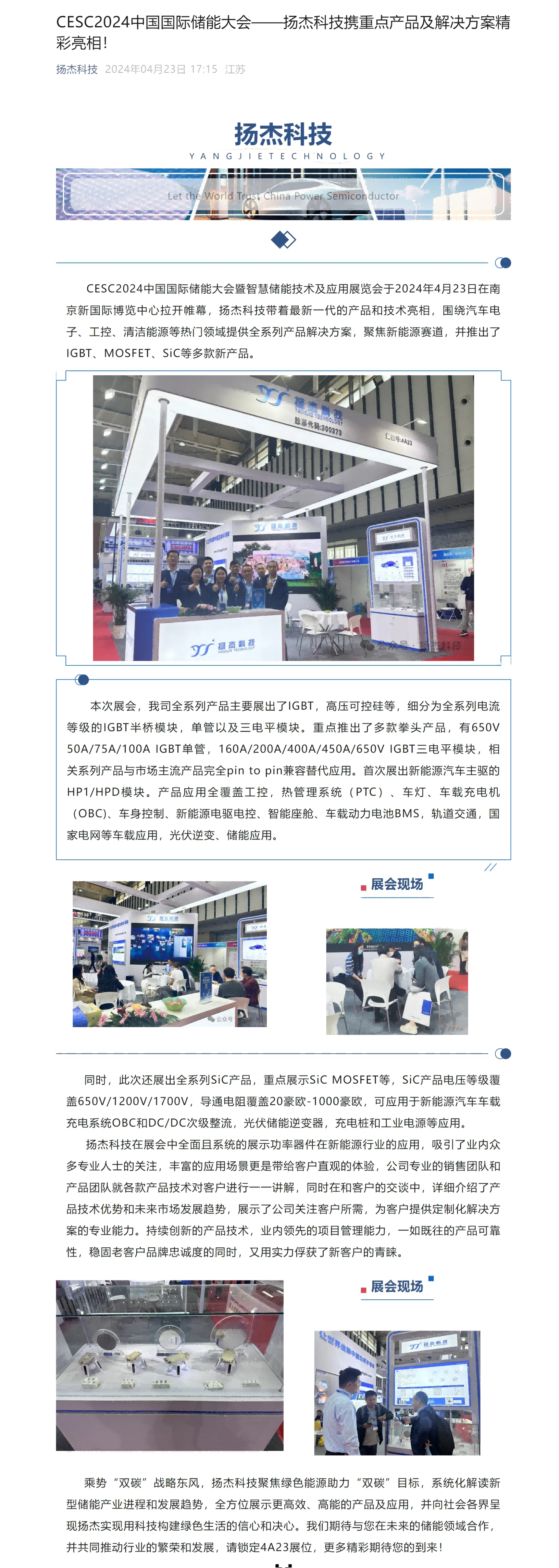 扬杰科技亮相2024全球车规级功率半导体峰会暨优秀供应商创新展